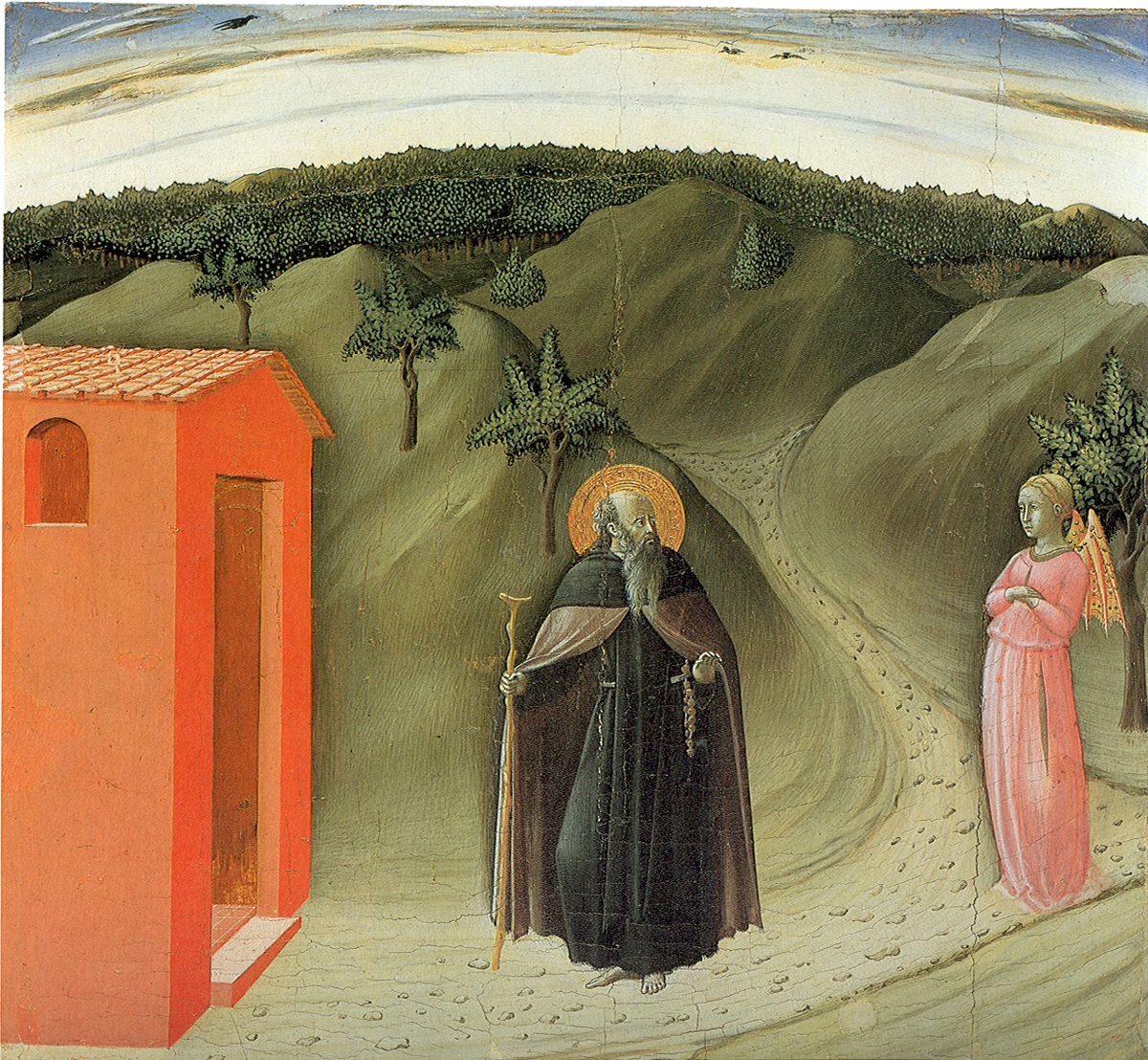 Master of Osservanza 'St. Anthony tempted by the devil in the guise of a woman' Gee, you'd think the wings would be a give-away. c.1435 {{PD-Art}