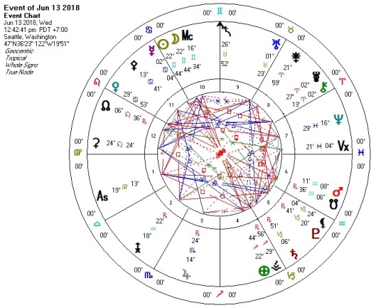 The New Moon occurs in Gemini on the 13th at 22 Gemini 44, at 12:43 PM Pacific time. The event, with Ceres, forms the base of a loose Finger of God, apex Black Moon Lilith, which of course is an empty point in space–so, symbolically, the New Moon helps point to what isn’t there, at least not yet, but can be felt, like a shift in the tone of a room, in an attitude. We might be tempted to see Pluto as co-apex, but don’t–it’s too wide for the quincunx to Ceres to count, though the NM perfects close enough to its quincunx to be counted, drawing in the power and danger Pluto’s presence can signal through the NM itself–so indicating timing, most likely, a Plutonian element at or near the NM moment. This configuration suggests that Nature, a maternal or authority figure, or ourselves, in the position of exerting our Will/ authority within a situation/ or exerting our position and its prerogatives, may act at the time of the New Moon and set in motion something powerful but invisible–something that stirs Black Moon Lilith’s depths of hidden, ignored, or denied matters, or of rage or injustice.