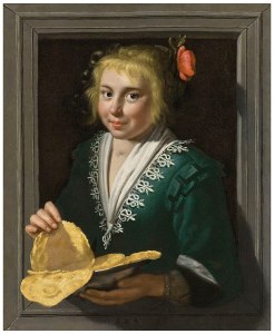 ‘A girl holding pancakes in a feigned stone window’ By Werner van den Valckert 1623 {{PD}}