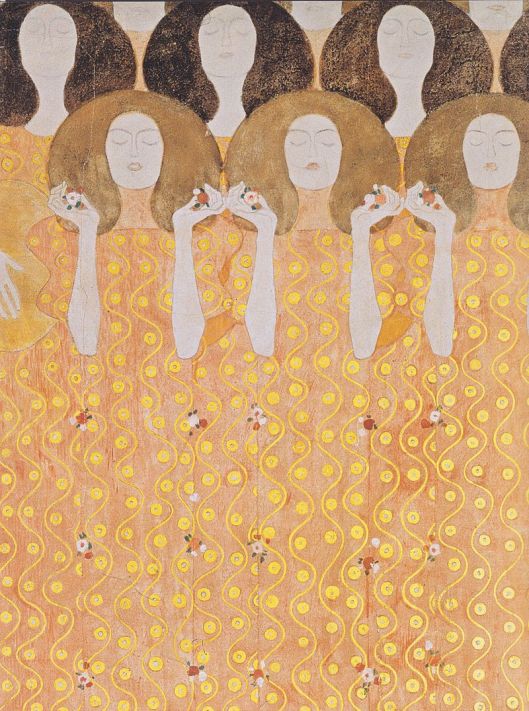 ‘Choir, Angels of Paradise, from the Beethovenfries’ (which I read as ‘Beethoven oven fries’–is that wrong of me?) Beethoven Frieze, 1902 By Gustav Klimt {{PD}}