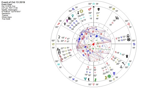 The Full Moon culminates at 2:07 PM PST at 20 Aries 13 on the 13th. The Full Moon is apex to a Finger of God with base of Pallas in Scorpio and Juno in Virgo. The Finger signals a kind of energy funnel, uniting the two base energies and showing how their synergy results in the apex energy. The import of this configuration is that the result found in the apex isn’t necessarily what one would expect from combining the two base energies. In this case, the detail-oriented, responsible, status-conscious entity focused on empowerment engages with the deep diving, deep thinking ‘Truth Warrior’, and what we get is a denouement made up of Full Moon events. These are Aries charged: assertive, even aggressive expressions of Self, Will, wanting, and/ or leadership. The individual may see this manifest as a confluence of inner and outer circumstances that bring both confidence and urgency to a choice to act; how this plays out will depend on the way the FM fits into the natal chart, but for everyone it will carry an emotional element, an awakening to or conclusion to some feeling about our personal place, role, or identity, and around our ability to act on those feelings.