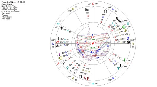 Along with the Black Moon Lilith point this Full Moon forms the base to a Finger of God with apex the asteroid Zeus. The Finger takes the harmonious expression of the two base energies and funnels it into a third, likely unexpected, outcome shown by the apex energy. This Finger suggests Lunar conclusions highlight matters denied, ignored, or that enrage us, probably prompting action that results in ambition or desire fulfillment. It’s as if a clock has been ticking, and the Full Moon brings it to ‘the appointed hour’, creating a confluence of energetic trends that move forward the personal agenda.