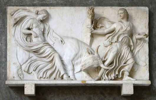 Two Bacchantes and a Bull, probably a sacrificial one. Unknown Roman origin. Vatican Museums, Rome. Description and Photo By Alvesgaspar CC BY-SA 4.0