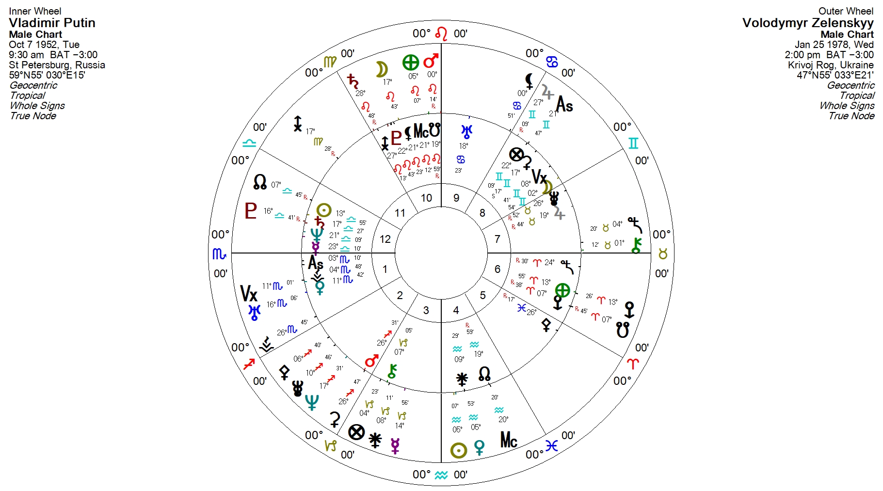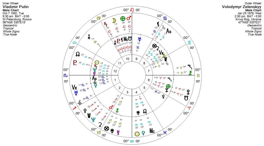 Z’s Saturn conjoins P’s Zeus, trine his Mars, and quincunx his Pallas, with Z’s Jupiter opposes P’s Mars, squares his Pallas, and sextiles his Zeus=this seems provocative for both parties, though more so for Putin, who may feel Z is out to thwart his ambitions, challenge his masculinity, and question his wisdom–and part of the challenge seems to arise from Z’s popularity, which P might try to cast in his own mind as both un-masculine (this might relate to Z’s comedic career, as P’s Sun-Saturn conjunction might find it very important to be taken seriously–I think Putin might miss the point of comedy) and unwise, though unwise only in the sense that it’s not what Putin would do! Z might just feel that Putin doesn’t act wisely–where Z would counsel P to tamp down ambitions, to focus less on implementing his own Will and desires (Zeus, Mars), P would counsel Z to get serious and get out of his (Putin’s) way–no surprise there.