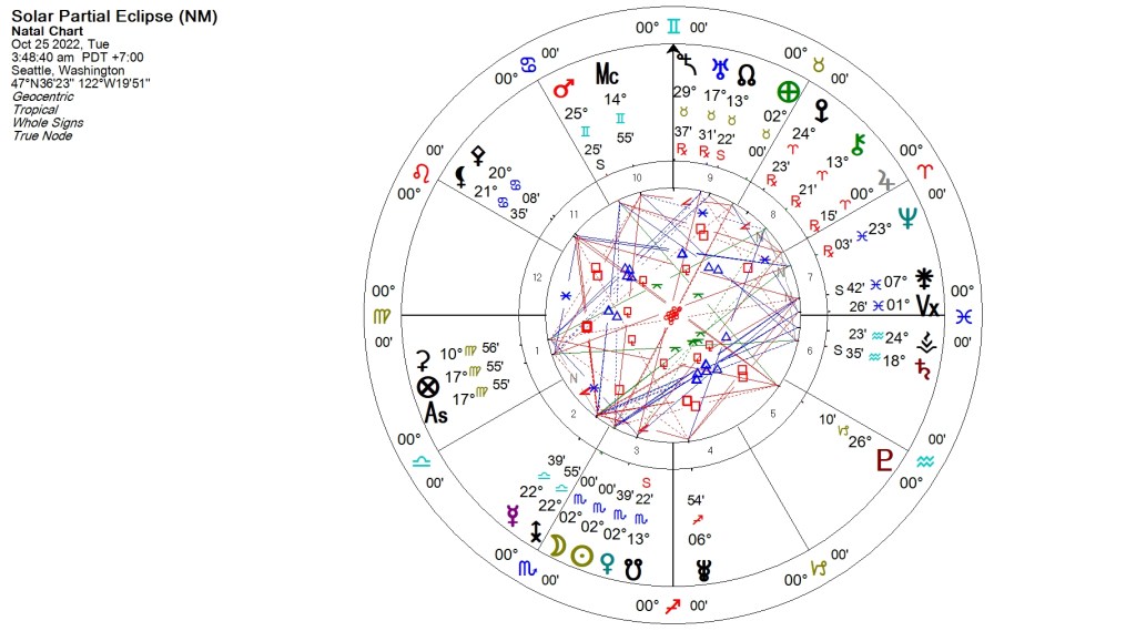 The meeting of Sun and Moon (a New Moon) occurs on the 25th PDT at 3:48 AM at precisely 2 degrees of Scorpio. Both bodies are just shy (by 39 minutes) of conjoining Venus exactly (though the Sun already did–see the following post)–and there’s only one other Lunar set of contacts, Jupiter just into Aries sextile Sedna at 29 tense degrees of Taurus, making a Finger of God with the New Moon as apex. At a typical New Moon, this would concentrate the energies into just a couple of ‘statements’; this being an eclipse, we see another level of concentration, in the way the bodies aren’t just in contact, but are closely aligned along the ecliptic (the plane of the Earth’s orbit around the Sun). When this happens, we have a total or near total blockage of the light as seen from our vantage point on Earth–and this symbolically suggests a wiping out of the flow of energies, an interruption that brings a reset that may appear as shock, catastrophe, surprise, revelation, re-shuffling, withdrawal, renewal, germination, a period of darkness before a re-emerging of light, even birth. Since a New Moon is an energy of new starts, this isn’t unusual, but the nature of the new start may be quite different than we anticipate–and we look to the sign in which the eclipse occurs, and the aspects it makes, for the story.