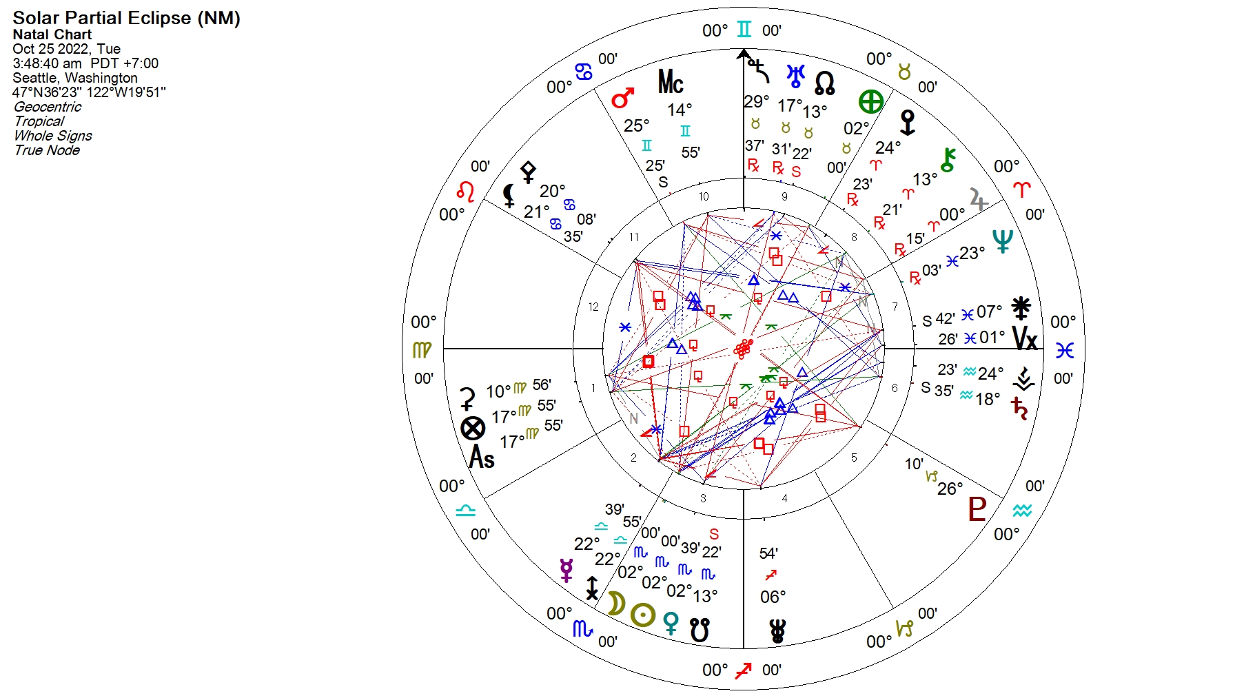 The meeting of Sun and Moon (a New Moon) occurs on the 25th PDT at 3:48 AM at precisely 2 degrees of Scorpio. Both bodies are just shy (by 39 minutes) of conjoining Venus exactly (though the Sun already did–see the following post)–and there’s only one other Lunar set of contacts, Jupiter just into Aries sextile Sedna at 29 tense degrees of Taurus, making a Finger of God with the New Moon as apex. At a typical New Moon, this would concentrate the energies into just a couple of ‘statements’; this being an eclipse, we see another level of concentration, in the way the bodies aren’t just in contact, but are closely aligned along the ecliptic (the plane of the Earth’s orbit around the Sun). When this happens, we have a total or near total blockage of the light as seen from our vantage point on Earth–and this symbolically suggests a wiping out of the flow of energies, an interruption that brings a reset that may appear as shock, catastrophe, surprise, revelation, re-shuffling, withdrawal, renewal, germination, a period of darkness before a re-emerging of light, even birth. Since a New Moon is an energy of new starts, this isn’t unusual, but the nature of the new start may be quite different than we anticipate–and we look to the sign in which the eclipse occurs, and the aspects it makes, for the story.