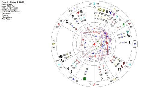 The Full Moon, at 25 Sagittarius 53, occurs at 1:30 AM PDT, and is apex to a Finger of God with base of Juno-Sedna–which sextile naturally catches the Sun, currently parallel to Mercury, at its midpoint. The only other viable contact is the Full Moon in (very) wide conjunction with Jupiter, its ruler. A Full Moon in Sagittarius brings a sense of ending, completion, or denouement, but one filled with optimism, that possibly presents new opportunities, and perhaps one that reveals needed knowledge, information, or ‘facts’, and these may either offer new directions to the individual or show precisely why the situation is viable no more.