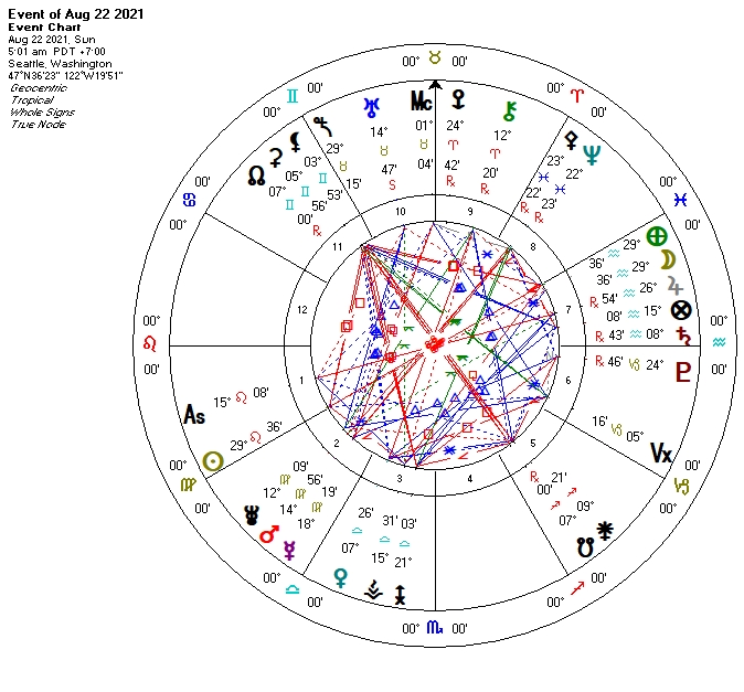 The Full Moon peaks at 00:54 AM PDT of the 9th at 16 Aquarius 59, and the most striking thing might be the tidy Kite configuration that doesn’t involve the Moon, though Luna does share a sign with one of the components, and another of the components rules the sign the Moon is in. That’s a tenuous connection but not an insignificant one; it suggests oblique links where Full Moon emotional outcomes may funnel through the shared-sign factor (a sign being an expression attitude), which just so happens to hold Pluto. That’s a naturally intense planetary energy ripe for projection or overreaction even in its most positive forms, and so all the more susceptible to being swept up in prevailing emotion. The fact that ruler of Aquarius, Uranus, is also part of the Kite only reinforces the prominence of the Waterbearer’s energy, which can surprise, shock, or show us something completely new.