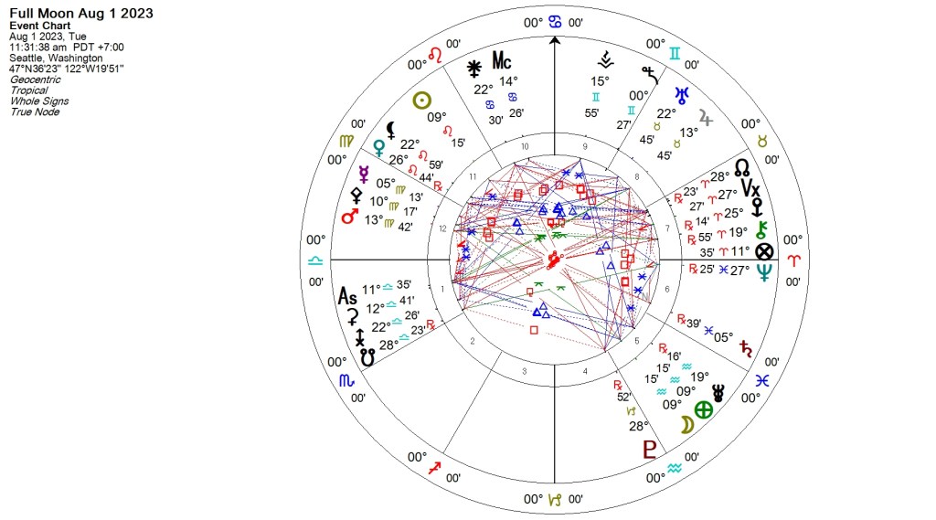 So if there’s a Lunar wind behind that Kite, of what does it consist? A Full Moon is a culmination of feelings and perceptions that cohere into an event, realization, or completion related to the sign in which the Full Moon occurs; this may also engage matters of the House in the personal nativity where this falls, and/ or in the House or other placements ruled by the Moon or matters related to the sign ruler, in this case, Uranus, so potentially the House where natal Uranus sits or aspects it makes or other energies it rules. That’s a lot of places the Lunar energy can touch and the Moon moves fast; that’s why tight aspect orbs and a clear picture of what it involves, and what it leaves out, is so important. You’ll notice many of those factors are personal ones, dependent on the Full Moon’s interaction with your chart. Here the focus is on what’s consistent for everyone, as far as possible.