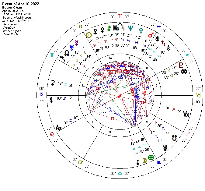 Then the Moon comes along on April 12 (at 5:21 PM PDT) and opposes the Sun-Chiron in Aries at 23 Libra 19, creating a T-square with Mars in Cancer=Cardinal (action) energy makes for a dynamic Lunar event; most likely we are faced with a clear picture of a wound to the identity that must be healed (a few of us will instead have that spotlight shine on some talent that we can no longer ignore expressing), and we see who we must appeal to, partner with, or cooperate with in order to make that happen (Libra Moon). It’s an emotional perception, so we may be at the mercy of our own fears and limitations and Self-designated comfort zones as these hem us in, short-circuiting progress in order to foster a sense of safety and control. That’s where Mars comes in; it takes the identity wound and the emotional attitude that would allow us to escape noticing it, and forces us (the T-square) to take action–simply because we care.
