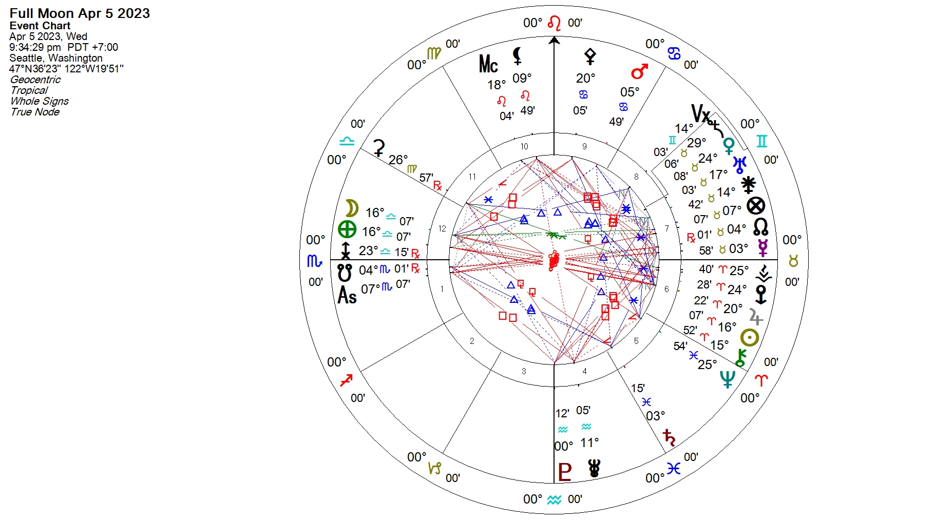 And we must acknowledge the Finger of God, with a base of stationary Venus (which technically goes direct about a half hour later) and Saturn in Pisces sextile Uranus in Taurus, apex the Full Moon (which, we should note, is conjoined the Earth). This suggests that revelation keyed to what the Venus cycle has exposed us to or made us face, which was initially just an inspiration, something we imagined or idealized (Pisces), has taken solid, real world form (Saturn)–and this is our first inkling of what this manifestation might entail. This involves a material surprise or spontaneous insight or even a radical change to the atmosphere or asset picture (Uranus in Taurus); we then observe the events of the Full Moon in Libra, which are the results of our Venus retro experience and what it changed in the real world that triggers our Uranian insight or shock, and which creates the Lunar event–one that asks us to stop navel-gazing (Aries) and start looking around at others, particularly those with whom we partner or cooperate (Libra).