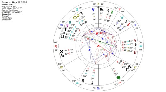 If we really want to be loose with our numbers (and who doesn’t, once in a while, in the name of recognizing the flow of energy?) we can find the eclipse as part of the base of a Finger of God with a wide sextile to Chiron, apex a Venus that’s not really quincunx Chiron, but is linked via the Lunar event. The Finger implies if we can heal something about our own ego, our expression of Will, our actions and choices (which might mean forgiving ourselves for something we’ve done), or heal some concept we have around our own aloneness, whether literal or existential (all Aries, linked to Chiron’s current location), and do this in tandem with or prompted by eclipse events, then we can harmonize some schism, unite in relationship or via aesthetics, or discover some vital Truth (Venus in Scorpio).