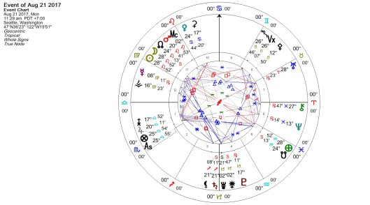 One other thing to note: though I don’t usually discuss aspect sets that don’t interact with the event (I find that dilutes the focus on, and so the meaning of, what we’re examining), this time I would like to point to a very close conjunction, only three minutes apart and moving ever closer at the time of the eclipse, of Saturn and Black Moon Lilith. BML is, as we know, a point, rather than a body; Saturn moving closer to perfection with that point suggests either suppression or materialization of rage, or of matters we or others have been working to ignore or deny. This may be a significant side note to the entire eclipse period, and could suggest secrets revealed will become the norm.
