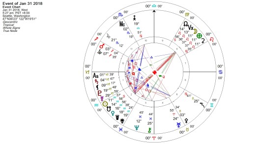 The Lunar eclipse of 31 January 2018 occurs at 5:27 AM Pacific time at 11 Leo 37, just two minutes past exact conjunction to asteroid Ceres, and acting as apex to a loose Finger of God with base of Black Moon Lilith (which is a point, of course, not a body) and Neptune; the Full Moon is also sesquiquadrate Chiron, but everything else is outside the orb for a Lunar event, even when that event is an eclipse.