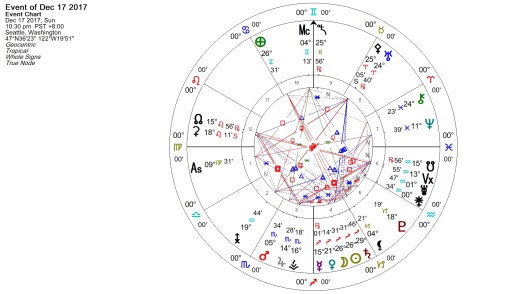 The eclipse may trigger anger and aggression, and a big need to make ‘I Am’ statements (Mars square), but why? Because we easily funnel what we have been agreeing to ignore or deny into consciousness–it pesters us, won’t let us rest–along with all the rage over injustices we’ve tamped down (trine Black Moon Lilith). We’re feeling removed from caring about what we usually value, distant from a prevailing sense of Love and relationship (Venus opp and retro), and this sets the stage for personal anger looking for an outlet–and it finds it in the irritating and threatening circumstances surrounding the reality picture (Saturn) and a sense of outrage that what’s wise isn’t being done, and is now at a breaking point (29 degree Pallas). And who receives our anger? The larger social order (Jupiter)–but wait, it might not be all bad (the novile), because what we may see is expansion of the energy of the eclipse ruler, the facts and faith finally bringing some sense of justice, of right.