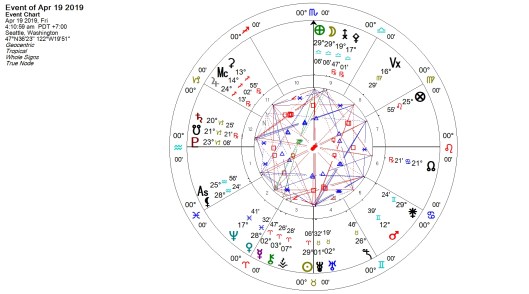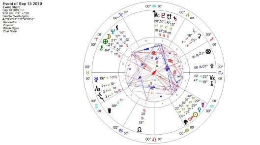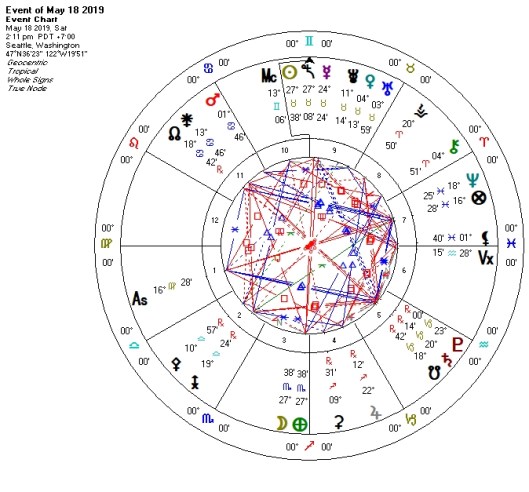 Now that you’re thoroughly alphabet-confused, we’ll describe what’s actually in the sky, as the Sun in Leo moves into place to complete the pattern. The Sun sextiles the North Node, forming one end of the rectangle; the other end is the South Node closely conjoined by Juno sextile Earth, the latter approaching conjunction to Saturn. It’s not unusual for the Nodes to act as ‘anchor points’ in the forming of this configuration, and as well for the Sun-Earth axis to move into position, almost as if our energy, attention, and surroundings develop until we reach a point to make choices (relatively easy ones–the sextiles) that have, one way or another, life-direction changing impact.