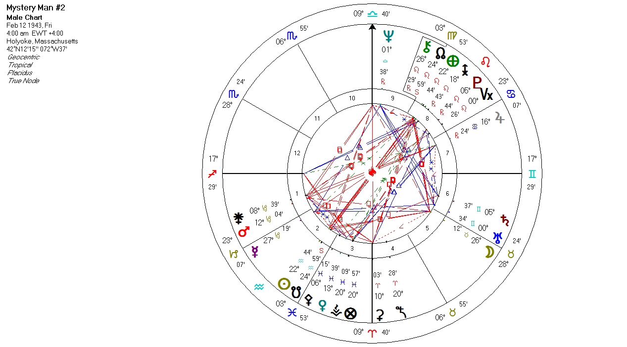 After a period of big and relatively long-lasting success, this man’s band went through some difficulties and some decline–and once they’d retreated somewhat from their more prominent status this man suffered cancer of the tongue–are we surprised, considering the emphasis on Merc and communication, the conjunction of Mercury with the Moon, and Pluto’s opposition to these? No, we’re not; illness in a part of the body representative of something critical to life expression is not uncommon with a sensitive individual when the road gets rough–and we can’t overlook the influence of the father here, as when this musician early on complained of extreme pre-performance nerves (a perfect expression of an anxious Aquarian Sun) the father (remember the family/ 3rd/ 4th emphasis) told him to just have a drink to calm his nerves–thus precipitating a serious substance abuse habit, again, not surprising with Neptune right there in everything he does. And there’s more family involvement, as this man formed his band with his brother.