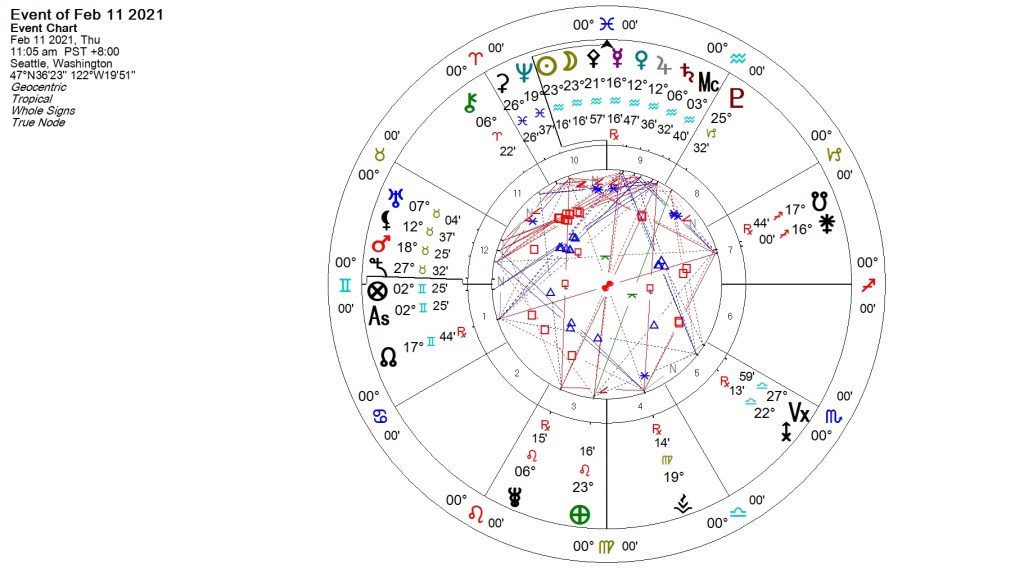 The crisis is shown by the Nodal axis, North in Pisces, South in Virgo, at 29 degrees, and so feeling the pressure to abandon the practical and workable (SN in Virgo) for a chance at making the ideal real (NN in Pisces). That’s the motivator, but we must be careful; the road to you-know-where is paved not just with good intentions, but with those attempts at genuine reform taken often as not for the right reasons, that fail because there was too much Pisces in the vision, not enough Virgo down-to-Earth details–but those are the people who meant well, who didn’t succeed but also didn’t harm. How do we handle those who disrupt in order to take advantage, to disenfranchise, to, in a worst case scenario, steal?