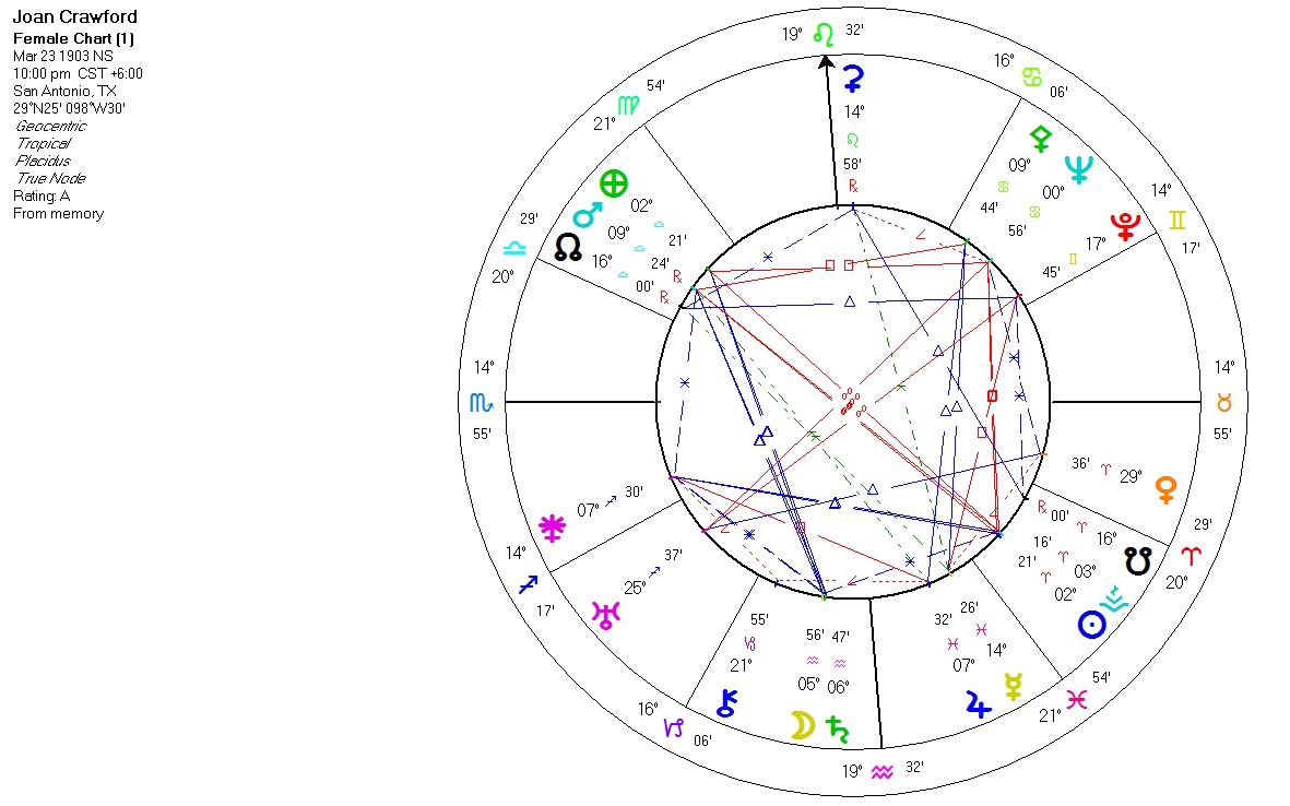 I really think there are many more maternal figures since Medea lost it who are worse than our subject; but it’s undeniable that her name has become a catchphrase for over-the-top histrionics and abuse (as well as the scourge of dry cleaners, through the admonition, “No! Wire! Hangars!”) Yes, I’m talking about the much maligned, and now nearly iconic symbol of dysfunctional mothering, actress and one-time Pepsico CEO Joan Crawford (23 March 1903, 10:00 PM, San Antonio Texas). To be fair to Joan, after a brief perusal of the mothering related factors in her chart, we’ll look at the chart of the adopted daughter who brought Joan’s alleged behavior to light, Christina Crawford (11 June 1939, 3:00 PM, Los Angeles California).